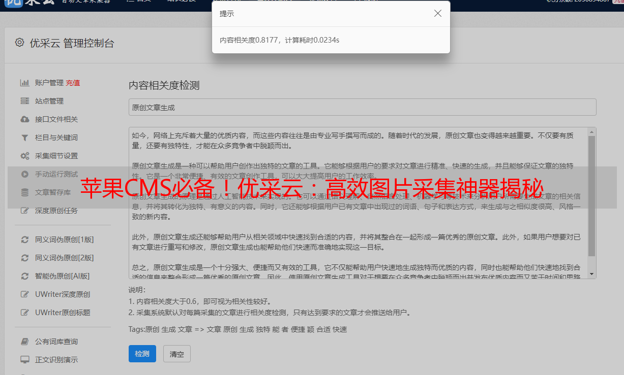 优采云,一款出色的专业图库采集工具,专为苹果CMS用户打造了一个便捷、高效的图片采集服务接口。凭借卓越的功能性与高质量的稳定性,赢得了众多用户的赞赏。优采云可助用户迅速采集各类文章所需要的图片素材,同时提供图像识别的辅助功能与批量下载技术,从而大大精简了繁琐的文章制作步骤。接下来,本文将就优采云在苹果CMS文章图片采集方面的应用展开详细介绍与应用建议分享。