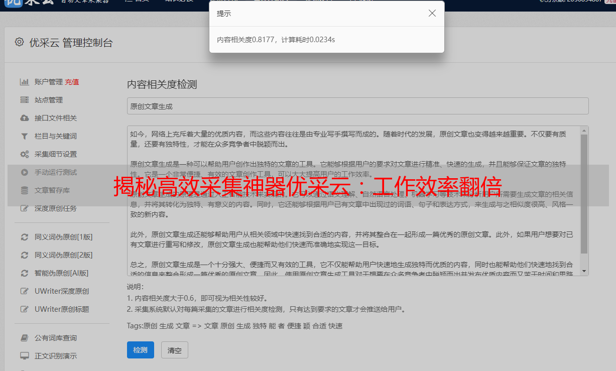 优采云 发布时间: 2024-04-07 14:36作为一位专业的作家,在下掌握了大量关于高效采集文章内容的方法和洞察力。在此篇文章里,我愿与您分享使用优采云平台的切身感受以及适用建议。作为市面上先进的文章采集工具,优采云具备高速且便利的特性,能助您提高工作效能。接下来,我将从各个角度深入剖析优采云,期望笔下的文字能对各位创作过程中的理解和实践起到积极作用。