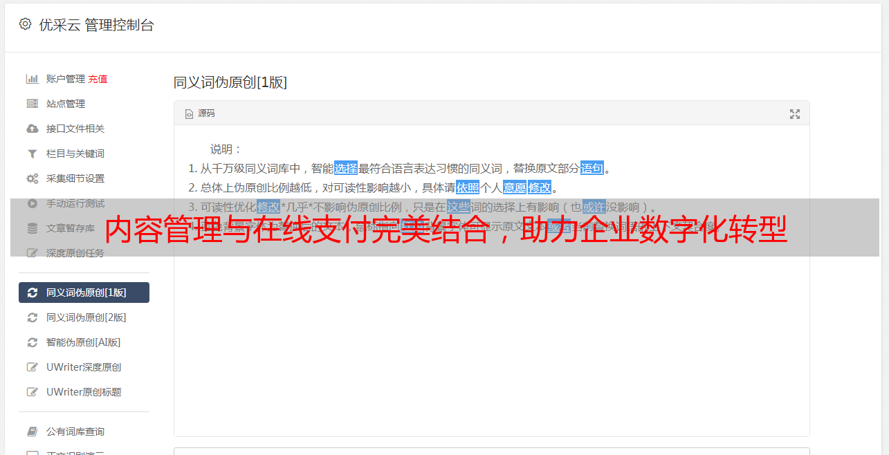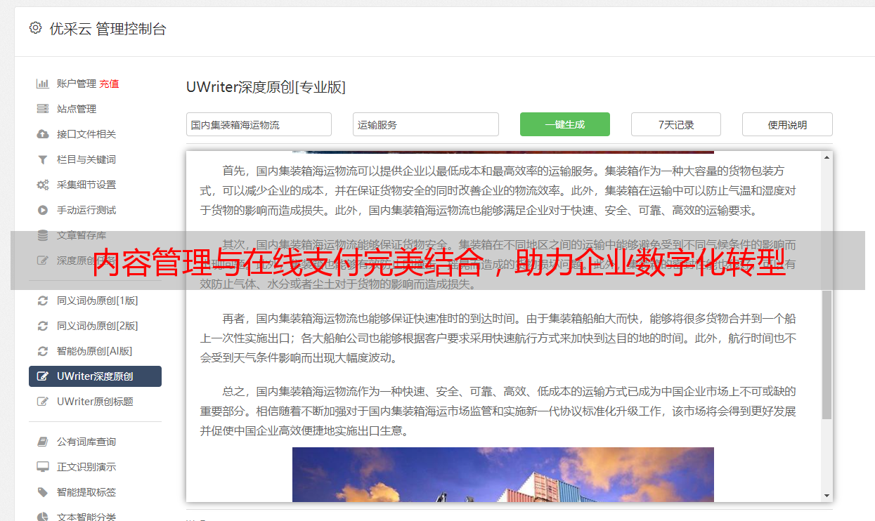 作为专注于内容管理领域的专业企业,优采云坚持以用户为核心,持续提升产品及服务质量,以满足客户多元的需求。在在线支付系统接入方面,我们不仅保证了稳定且安全的技术支撑,更关注用户体验与数据保护,助力企业成功实现数字化转型。