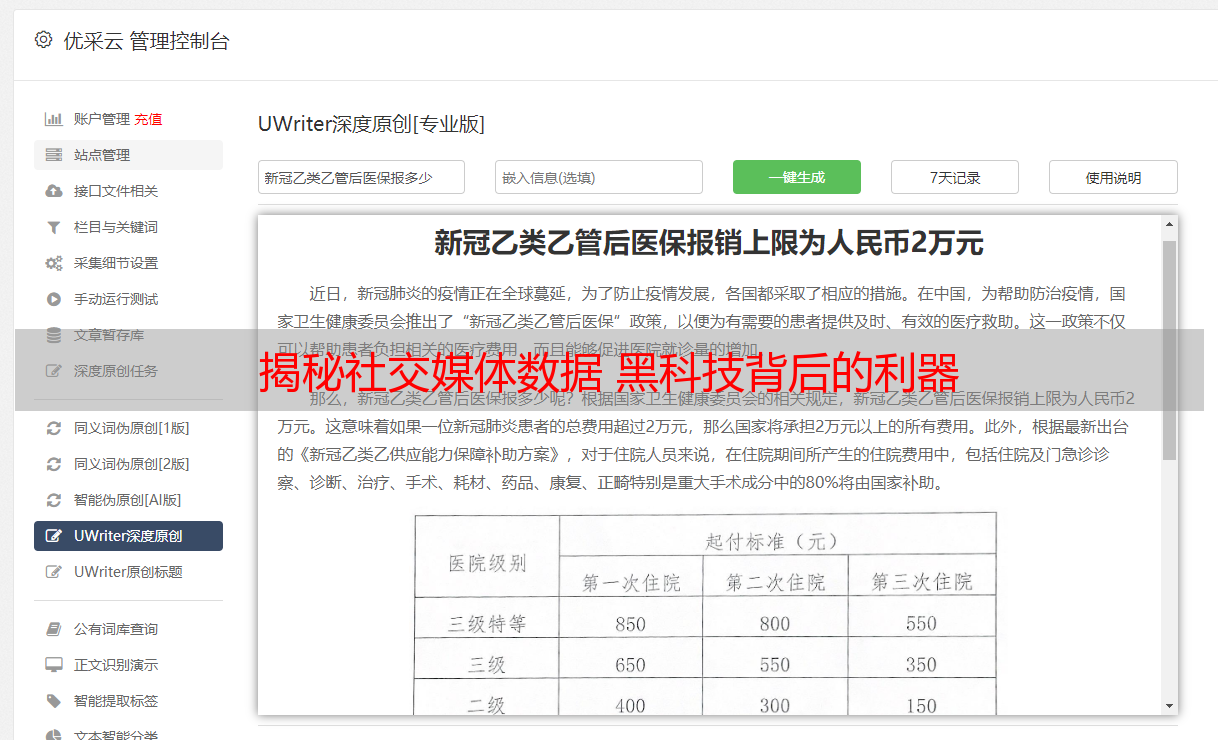优采云,一家专注于数据分析及统计的高端企业,始终坚持为客户提供全方位精确的数据分析支持。面对当下信息繁杂的时代,社交媒体已经逐渐成为了人们获取及分享信息的核心渠道。借助于科学前沿的数据分析技术,优采云能够协助客户深入研究社交媒体大数据,进行深度学习,从而准确剖析用户行为模式、发展趋势以及喜好特征。