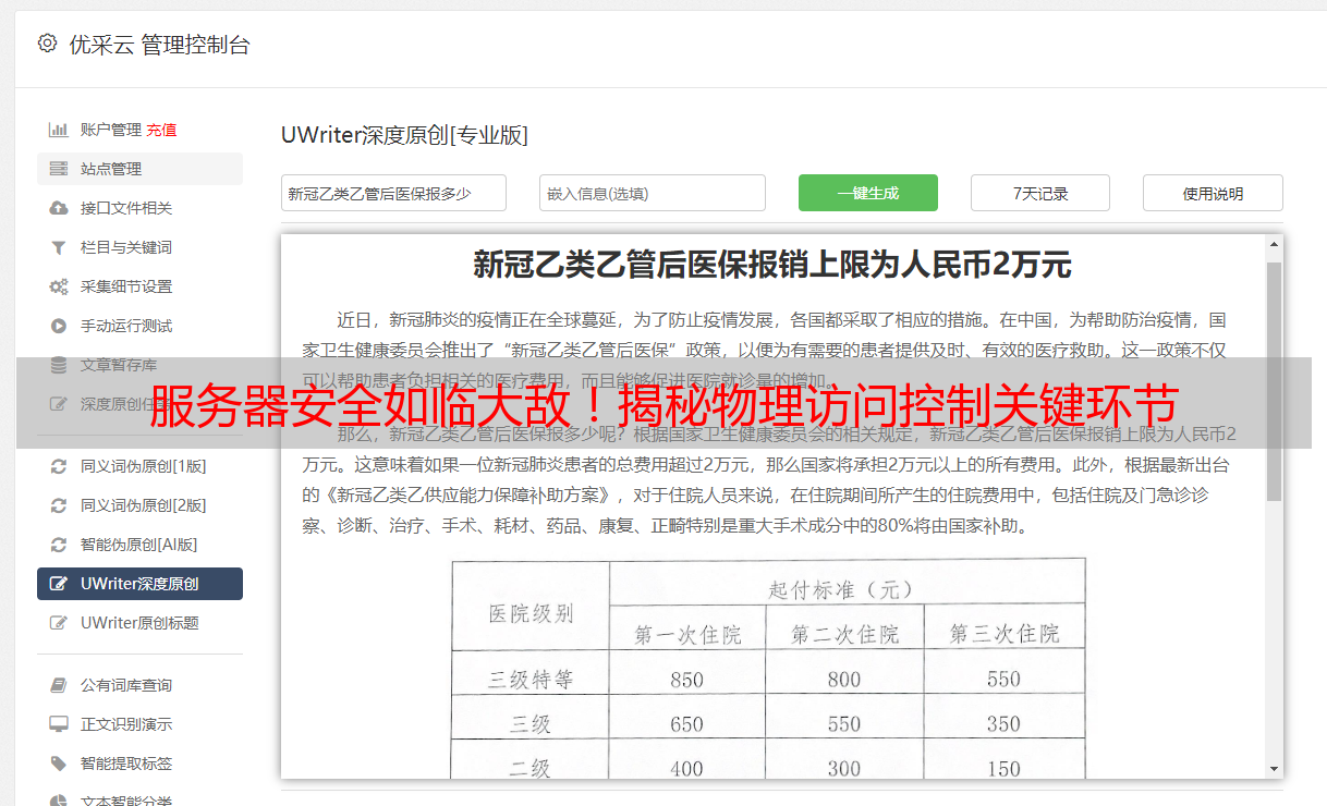 针对物理访问控制环节,优采云确立了谨慎的策略与严谨的流程体系。首先,实行严格的钥匙及门禁卡管控,确保仅授权用户方可持有相关权限;其次,规范员工出勤及权限变动程序,实时跟进权限信息的更新;再次,定期举行仿真训练和应急预案培训,提升全员应变突发状况的能力。