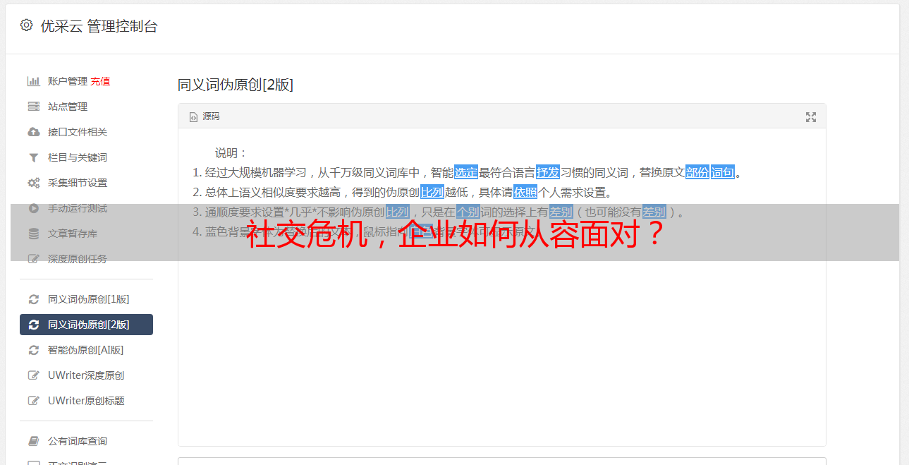 优采云不仅助力企业成功应对社交媒体公关危机,更能助其提升品牌信誉。凭借卓越的品牌管理体系建设能力以及准确针对目标群体的定位服务和高效的营销策略规划,优采云使企业能够塑造崇高的品牌形象,增进客户忠诚度并提升市场竞争力。