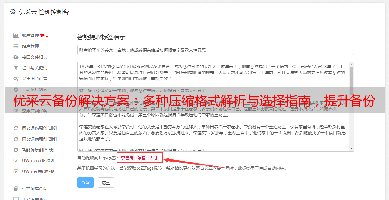 优采云 发布时间: 2024-04-22 08:36优采云作为备份与恢复领域的专家,其备份解决方案最大优势在于支撑多种备份文件压缩格式,此举对于备份文件的大小、传输效率及储藏成本具有重大影响。为提升用户对优采云的运用效果,本文将深入解析相关技术要点,以及不同备份文件压缩格式的区别与选择标准。