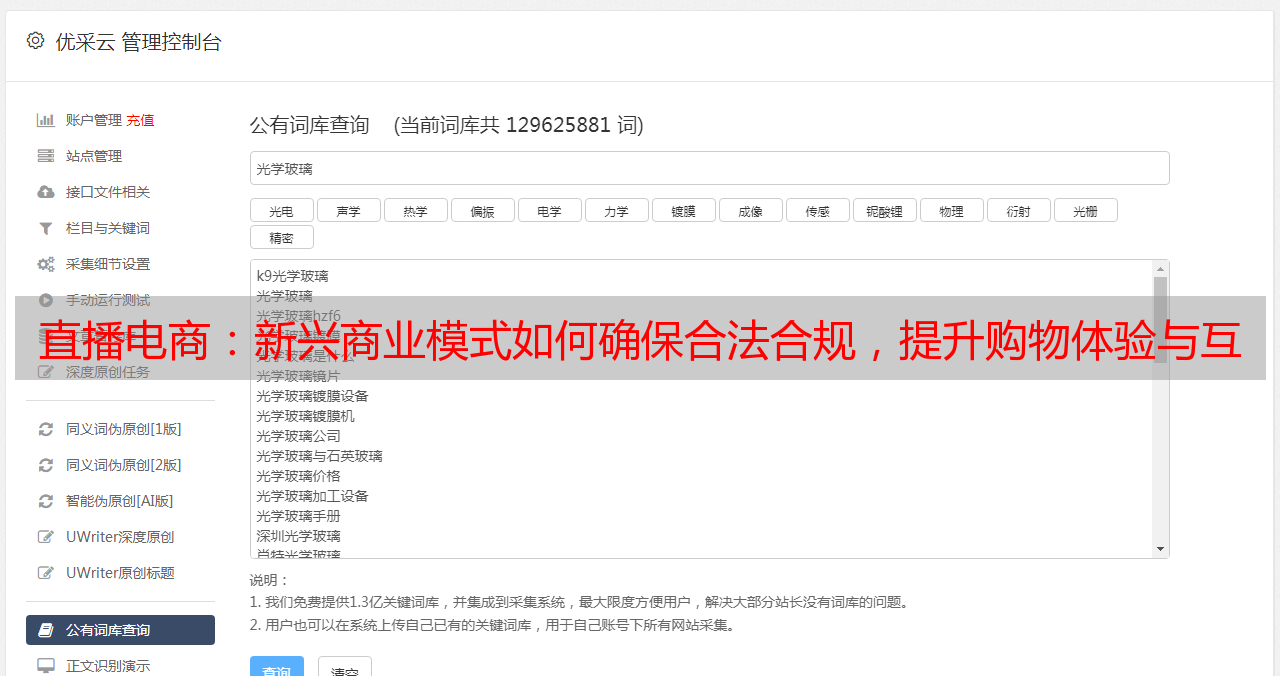优采云 发布时间: 2024-05-23 04:46伴随着互联网科技日新月异的发展,直播电商作为一种新兴的商业模式,受到了广泛关注。通过直播电商模式,消费者可以在观看直播的同时进行购物,从而增强了购物体验并提高了互动性。随着智能化设备普及率的逐渐上升,直播成为了企业展示商品、提高销售额的重要工具。然而,在进行直播带货时,必须确保其合法合规。