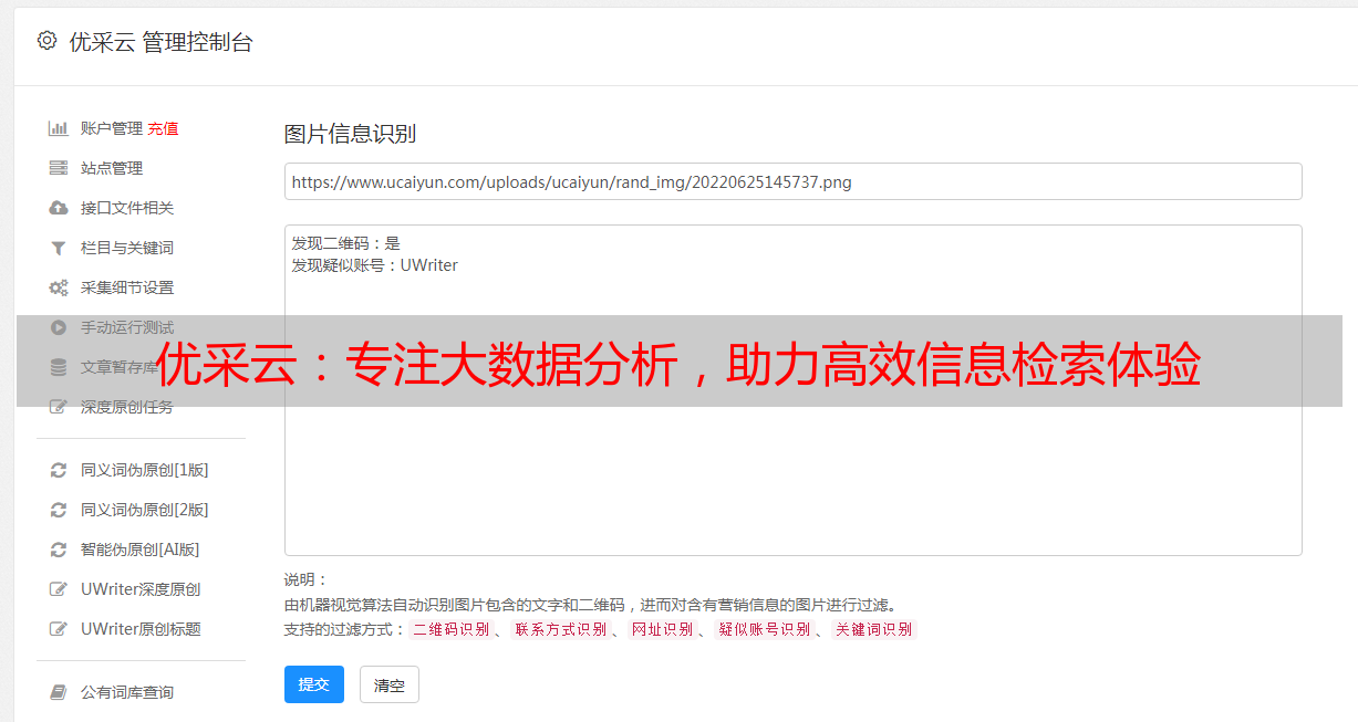 在优采云平台上,用户可利用图像搜索功能来上传或输入图片URL以获取相关图片信息。该服务采用深度学习与神经网络算法,能精准识别并匹配图片内容,从而协助用户迅速定位所需图片资料。
