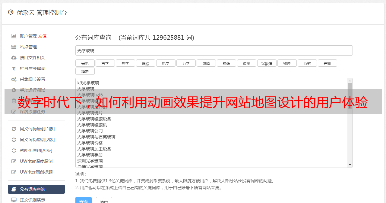 在制定网站地图设计策略时,需深入思考如何将动效元素纳入考量,以发挥其在SEO优化中的作用与价值。优采云拥有多样化的SEO优化工具及指南,助力用户将网站地图在搜索引擎中的展现有序推进并提高排名。通过适度运用动效元素,可提升网站用户体验及页面加载速度,同时避免因过度使用而引发页面加载缓慢及SEO排名下滑等问题。