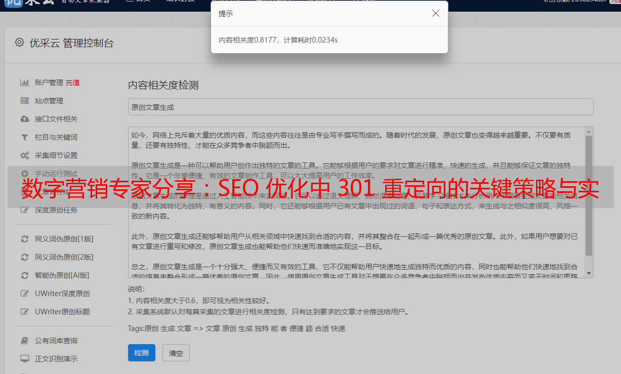 本文旨在让读者对SEO优化中的301重定向处理机制有更为全面的认识。作为一款卓越的数字营销利器,优采云平台凭借其丰富的功能,提供了高效便捷的301重定向服务,以此助推网站结构优化、用户体验升级以及搜索引擎排名的攀升。在未来的网站优化实践中,优采云的301重定向工具或许将成为您的得力助手,助力提升网站SEO价值,从而达到更佳的营销成果。