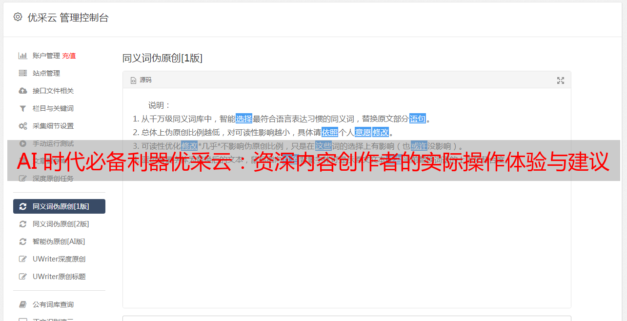 优采云 发布时间: 2024-06-06 09:25在AI技术疾速前行的时代背景下,优采云为用户提供了高效且便捷的文章伪原创工具,已成为创作者及网络营销从业人士必备之利器。本篇文章将从资深内容创作者视角出发,分享对优采云的实际操作体验,并提出相关建议,旨在协助广大用户更好地运用此工具,提高内容创作效率。