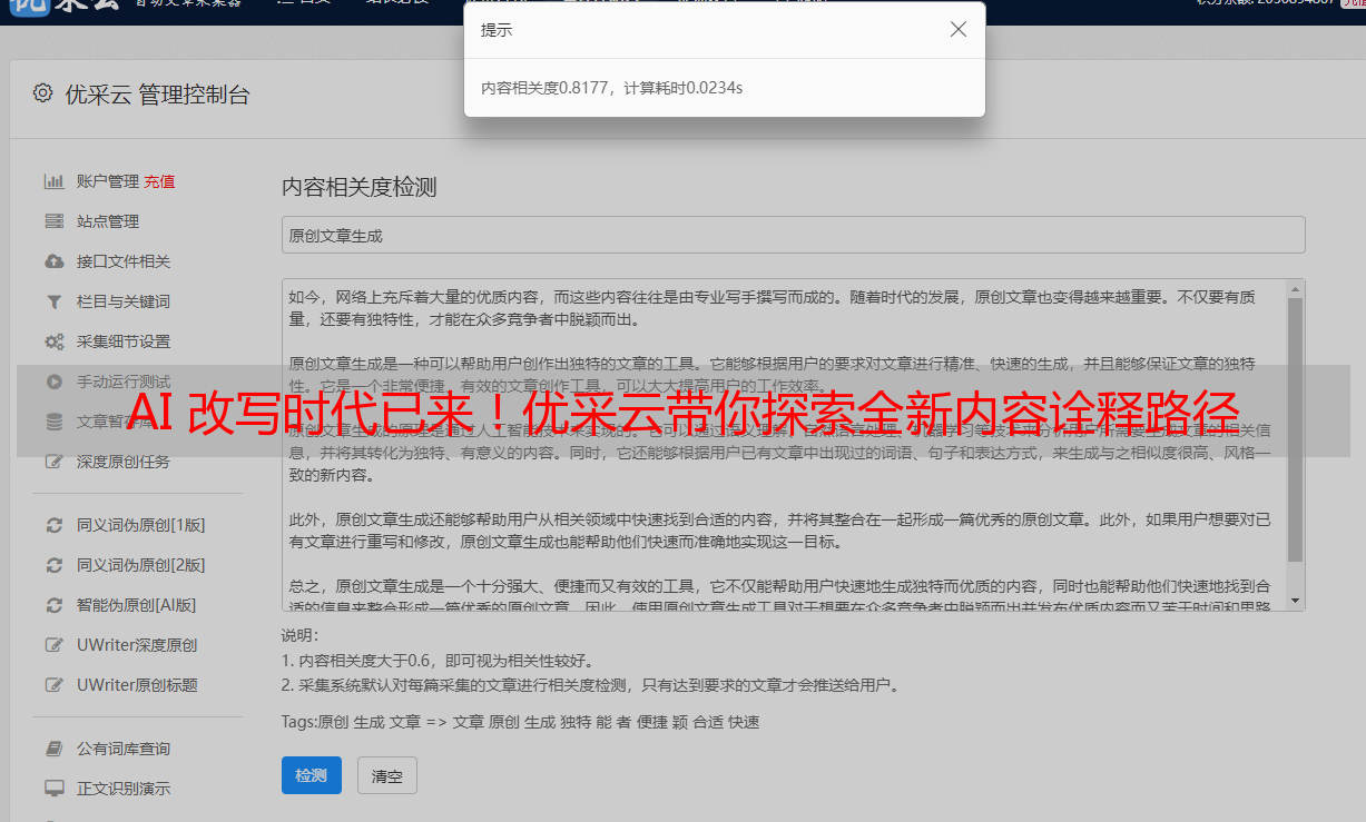 尽管优采云AI能出色地完成文章改写工作,然而,使用者仍需审慎对待并适度调整改写成果。这主要源于AI在应对特殊情境或复杂逻辑时难免出现偏颇。因此,建议用户务必严格审视改写后的文稿,以保证信息的精确度与逻辑的严密性。