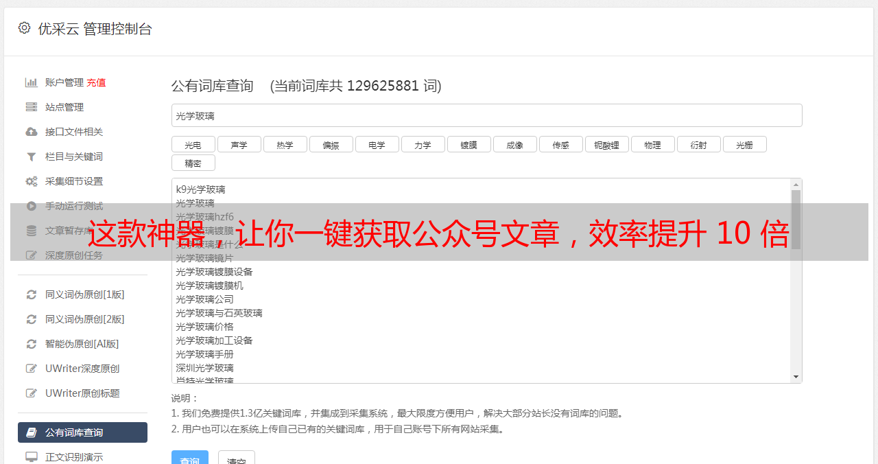 优采云是专精于微信公众号文章采集领域的工具,能有效帮助用户精准捕捉、获取到公众号内的文章,且支持多样化的数据导出格式。借助优采云,用户可轻松获取文章的标题、正文、配图以及阅读量等关键信息,这对市场调研、内容创作乃至学术研究均具有重大价值。