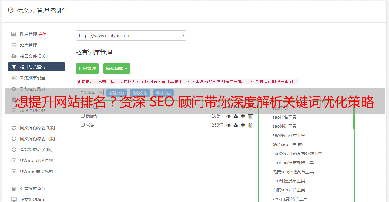 优采云 发布时间: 2024-06-16 04:56在数字营销盛行的当下,SEO(搜索引擎优化)已然成为提高网站流量和品牌知名度的重要途径。其中,关键词优化对于提升排名至关重要,也是众多网站经营者关注的焦点。本文将从资深SEO顾问的角度,深度解析关键词优化排名的策略,并着重介绍优采云这一实用工具的操作方法与实战经验。