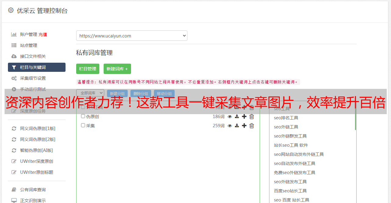 优采云是款专业级别的内容采集软件,其内容涵盖文字及图像,尤其在图片搜索方*敏*感*词*备显著优势。优采云可帮助用户高效完成文章配图的一键采集,极大地节省查找图片的时间。此外,优采云拥有丰富的图库资源,涵盖各类风格与主题,以满足多元化的内容创作需求。