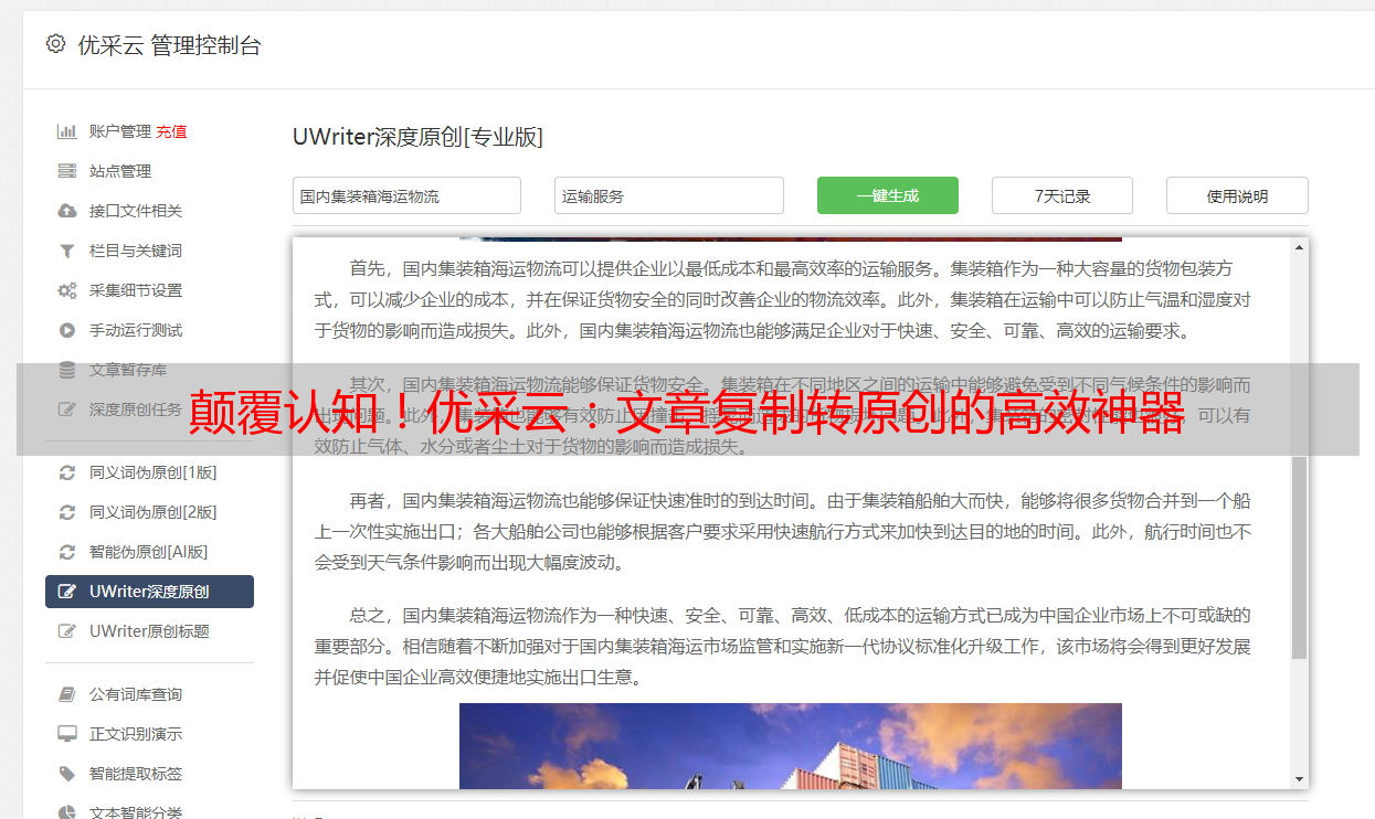 优采云 发布时间: 2024-06-17 02:11优采云,这是一款高效而实用的文章复制转原创工具,它采用尖端科技为用户提供独特且高质量的原创内容。身为内容创作者,我深刻理解原创文章的价值,优采云能在确保内容质量的基础上,大幅提高写作效率。下面,就为各位详细阐述优采云的主要功能及其如何助力用户创造出新颖的文章。