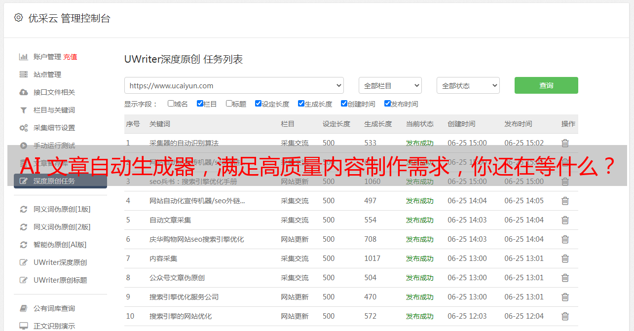 优采云 发布时间: 2024-06-18 04:08随着数字媒体行业的发展,对高质量内容制作需求持续增长,而优采云AI文章自动*敏*感*词*的问世,为满足此需求提供了强有力支持。该工具以其迅速生成海量内容及相对可靠的质量保障,极大提升了企业与个体用户的运营效能。本篇文章将详细解读并分享优采云AI文章自动*敏*感*词*的使用经验,助力读者更高效、优质地应用这一技术工具。