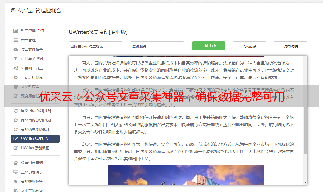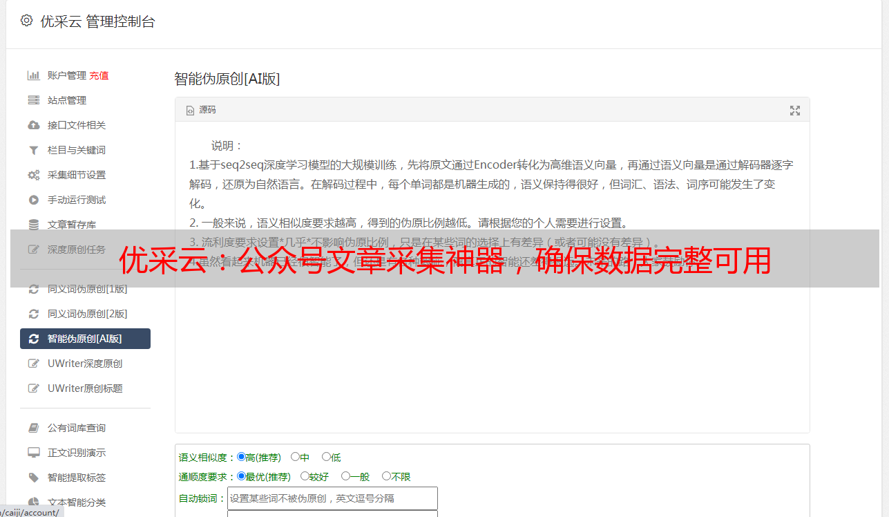 优采云作为一款整合的数据收集与分析工具,除了提供数据采集服务外,亦具备相应的数据解析能力。借助其所提供的分析工具,使用者可执行公众号文章的文本及情感剖析等操作,从而精准洞悉文章深意,发掘潜在趋势与模式。