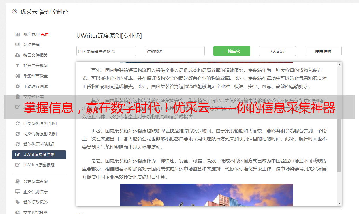 优采云为专业网络文章采集平台,运用尖端数据抓取技术,从海量互联网网站自动获取用户所需要的文章资讯。本平台提供个性化的检索条件设定,用户可依据关键字、作者及发布日期等元素进行精准筛选,迅速获取相关信息。