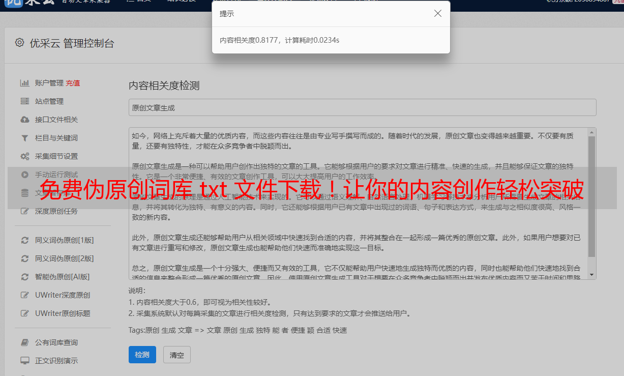 优采云 发布时间: 2024-06-19 23:40在当今数字时代背景下,无论是何种行业,内容创造均成为了关键性环节。随着搜索引擎优化(SEO)的重要性日益提升,伪原创工具逐渐受到欢迎。优采云,这一卓越的SEO工具,因提供丰富且精准的伪原创功能而备受关注。本文旨在深入解析如何巧妙运用优采云,同时公开免费的伪原创词库txt文件下载资源,助力大家在内容创作领域取得更大突破。