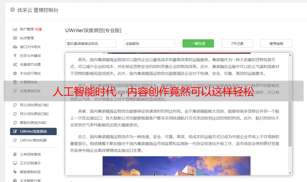 优采云 发布时间: 2024-06-22 05:28在数字化革命浪潮中,人工智能(AI)技术的快速提升已成产业改革的强大推力,尤其对于内容创作行业更具深远意义。原创文章在线生成网站的问世,大大提升了写作进度且给创作者带来了空前便捷。今日,作为一位深耕内容领域的创作者,我有幸向各位详尽介绍与分享优采云AI原创文章在线生成平台的实际应用心得及宝贵建议。