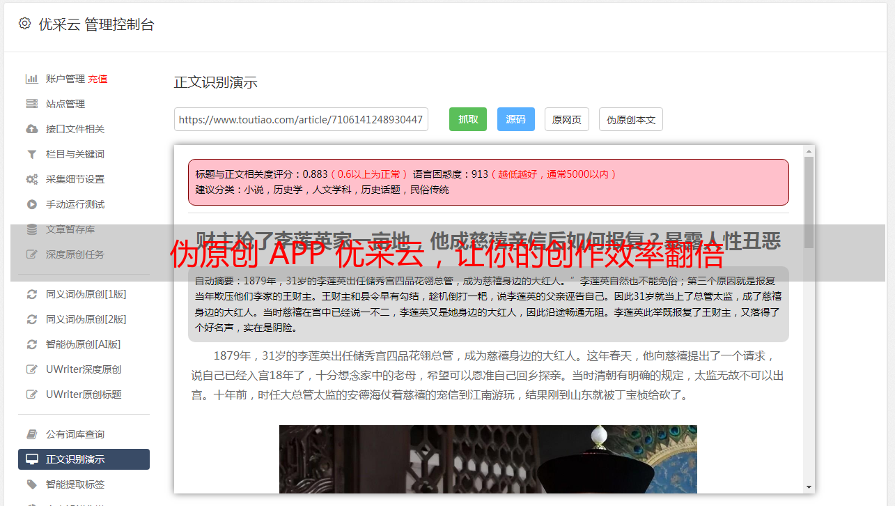 优采云,专注于创作人士的伪原创工具,其主要解决方案在于辅助定制低相似度的全新作品。应用内含文本改编、同义词替换及语序调配等高级功能模块。借助此套模块,用户可便捷、有效地将原始文章转化为新颖且独具特色的原创内容。
