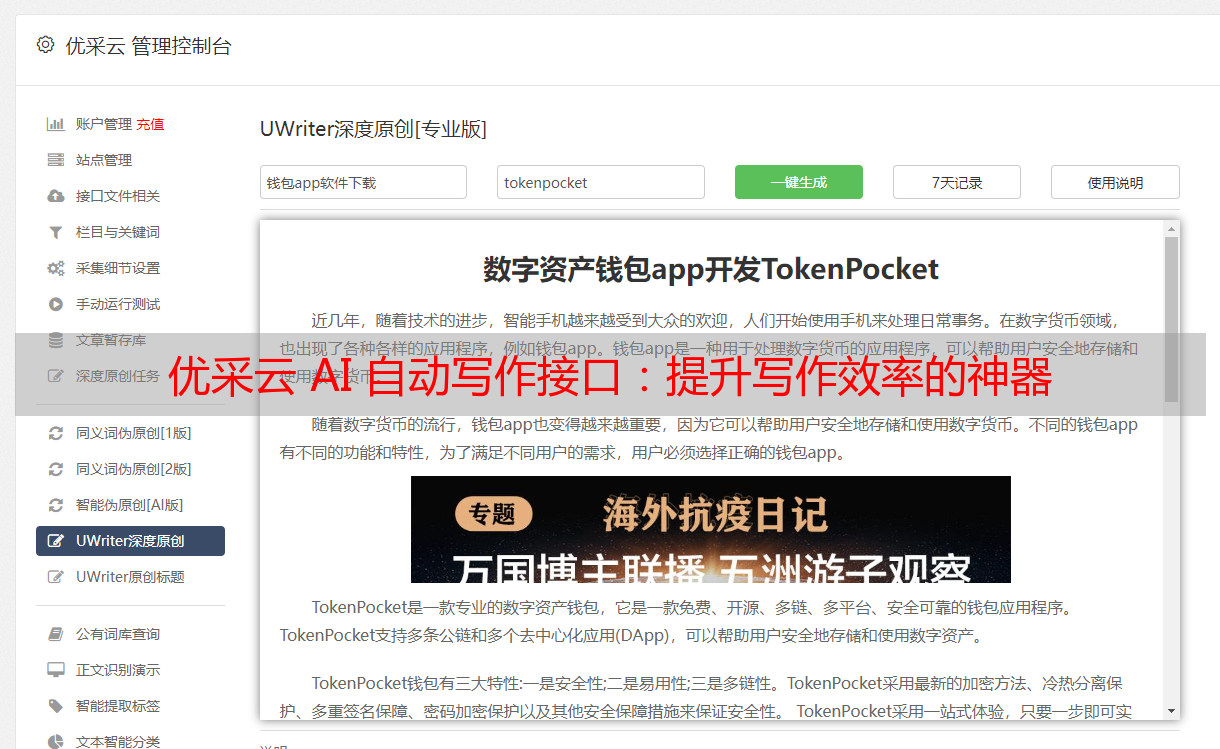 概括而言,优采云AI自动撰写文章接口乃高效的内容创建利器,协助用户迅速产出大量优质文本。经适当配置与善用,不仅大大提高写作效率,亦助力提升文章质量。展望未来,凭借科技的持续进步,优采云将有望供应更智能化及私人定制化之服务。