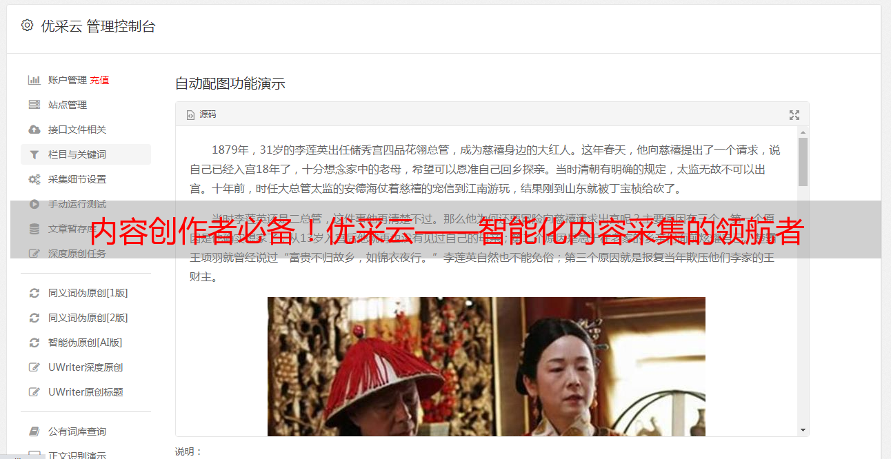 优采云乃智能工具集成平台,集自动采集多种功能于身,特以先进算法实现互联网广泛内容高效获取及用户所需精准编排发布。面对内容主导的当下,优采云犹如内容创作者的高效伙伴,助力其将大量宝贵时间精力投入至创造高品质原创作品之中。