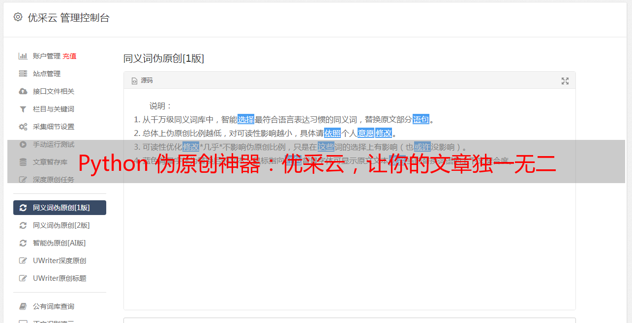 优采云 发布时间: 2024-06-23 23:20在当前信息爆炸的环境中,优质内容创作呈增长趋势,Python独特的强大功能与丰富的全套库为其在伪原创文章生成领域赢得了重要地位。优采云作为一款融合了人工智能及大数据技术的伪原创工具,能在尊重版权法规的基础上,协助内容创作者迅速生成独具特色的文章内容。本文将详细解析优采云的应用并提供实践操作建议。
