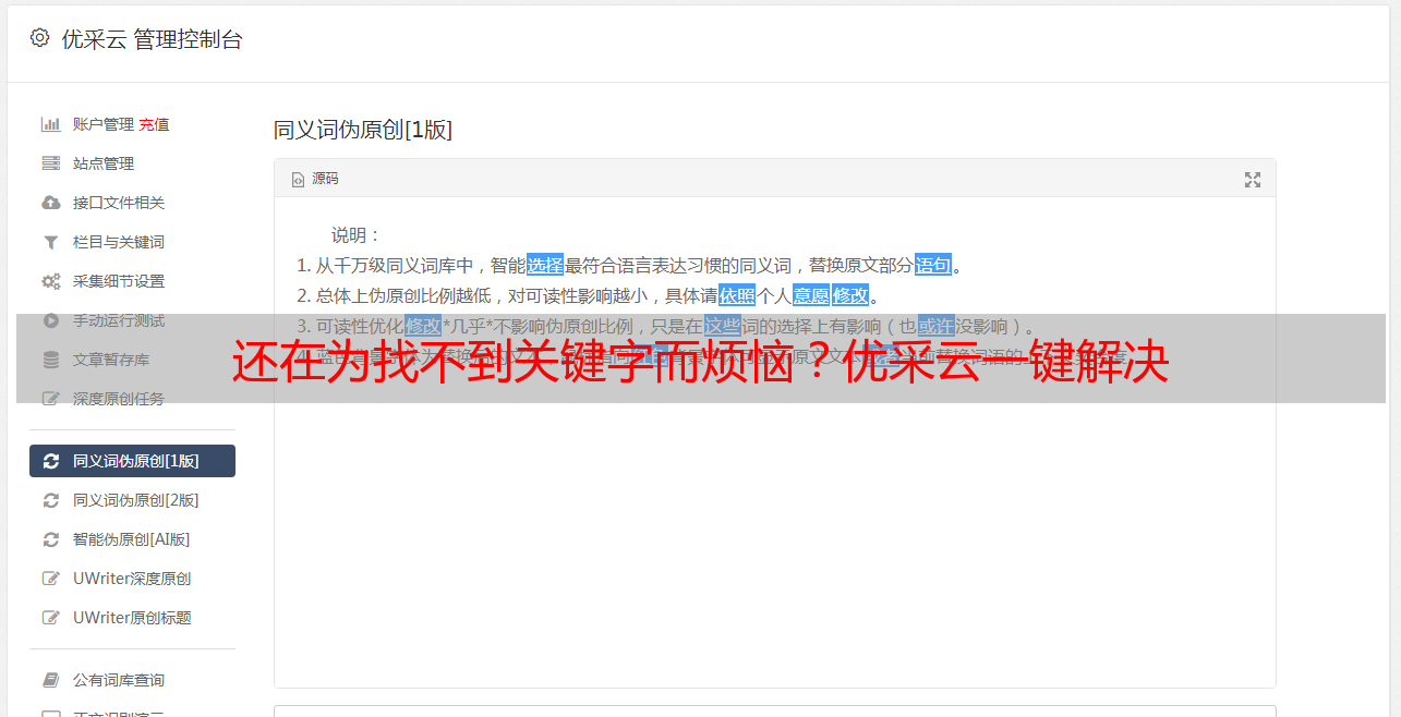 优采云 发布时间: 2024-06-24 11:24在数字化时代海量信息之中,关键字采集已成为内容创作者掌握资讯及洞悉趋势的关键手段。优采云作为功能卓越的数据采集工具,以其便捷性与高效率为文字工作者提供了精准的关键词采集方案。本文将从多个视角详尽阐述如何借助优采云进行关键字收集及其如何将采集所得数据转化为具有深度价值性的文章内容。