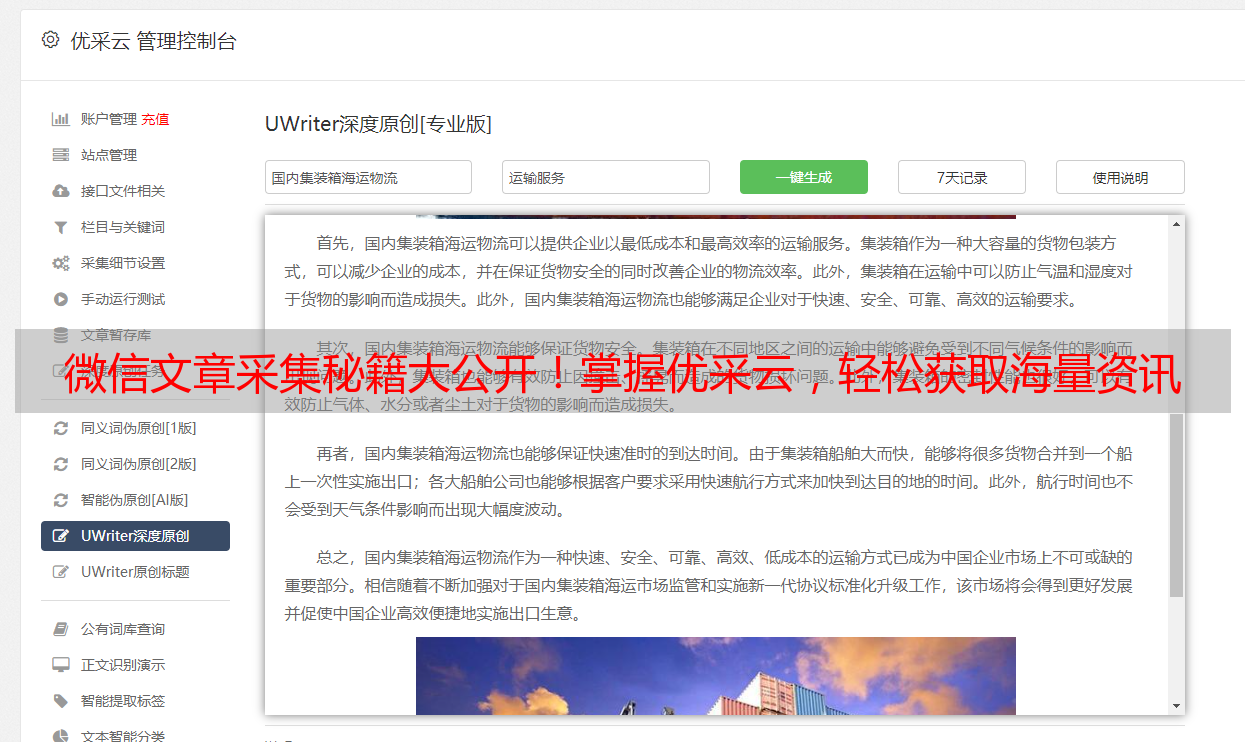 优采云 发布时间: 2024-06-24 15:42随着数字时代信息大爆炸,微信于高活跃用户量的推动下,每日产生大量文字输出,既有独创性文章,亦有热辣资讯分享。面对如此海量且实时更新的资讯宝库,如何巧妙收集及利用这些珍贵资源,已成为企业和个体关注的焦点。在此背景下,优采云作为专业数据采集工具,其在微信文章采集领域的应用显得至关重要。本文将深入解析优采云的操作方式及技巧,助力您更高效地运用该工具进行微信文章的采集与利用。