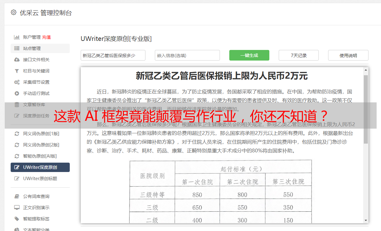 优采云AI框架,借由人工智能科技构建的写作助手系统,立足于用户自定义的主题及需求,可自主产生优质稿件。此框架融合了自然语言处理(NLP)、机器学习与大型数据分析等尖端技术,使文章撰写过程更为高效且智能化。