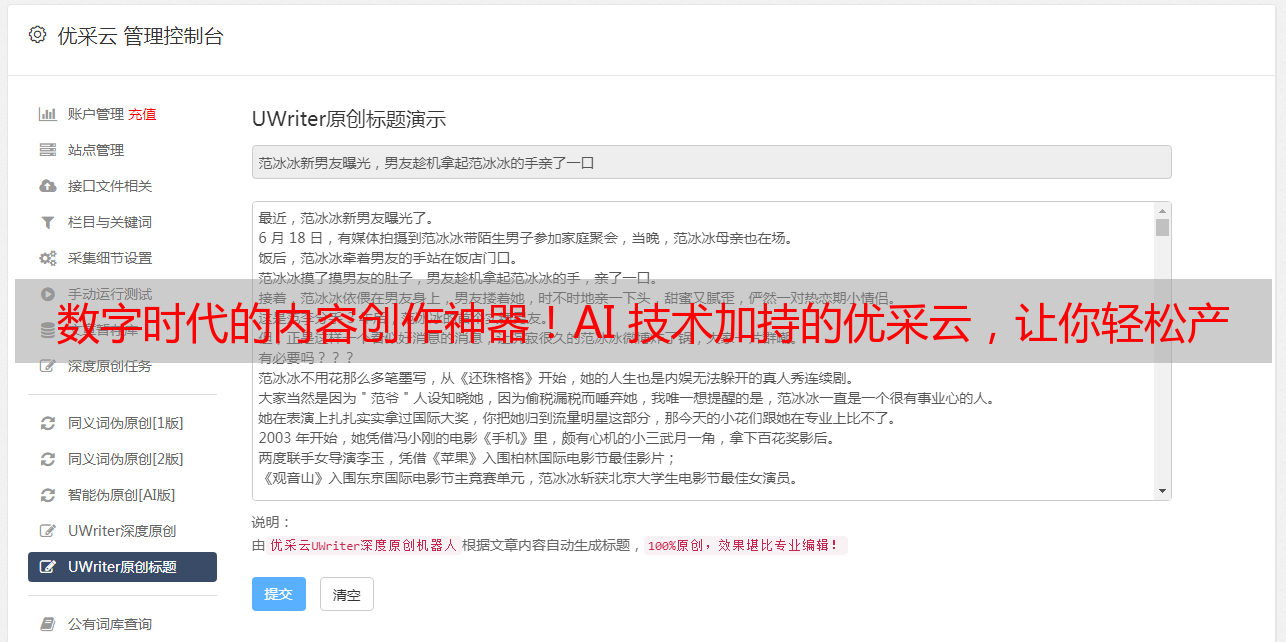 关乎版权及合规,尚需特别提及,尽管优采云集团提供了伪原创服务,但用户在实际应用中务必恪守相关法律法规。所产生之内容严禁干扰他人版权权益,并确保其真实准确且符合法令规定。优采云用户在使用过程中,有义务对内容进行审慎审核。