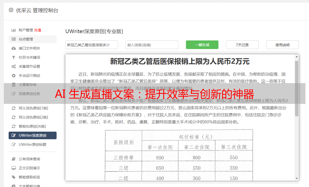 优采云 发布时间: 2024-06-28 09:06随着数字科技的崛起,直播作为一种新的高效传播形式,已然成为各大企业品牌营销和信息传递的核心途径之一。然而,直播内容的策划与文案撰写往往需要投入大量时间和精力,因此,AI生成直播文案技术的出现,无疑大大提升了工作效率及创新性。本篇文章将以优采云为例,深入剖析其在AI生成直播文案领域的实际运用,提供实用建议,同时对该技术的未来发展进行展望。