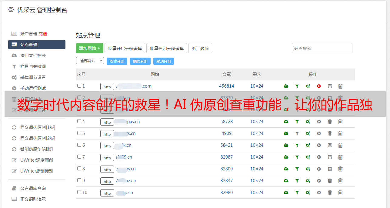 此外,优采云具备批量处理服务,用户可同时上传多篇文章,有效提升工作效率。此项服务对需大批量创作的企业及自媒体尤为便利。借助该平台伪原创功能,用户可快速生成优质原创内容,满足市场需求。