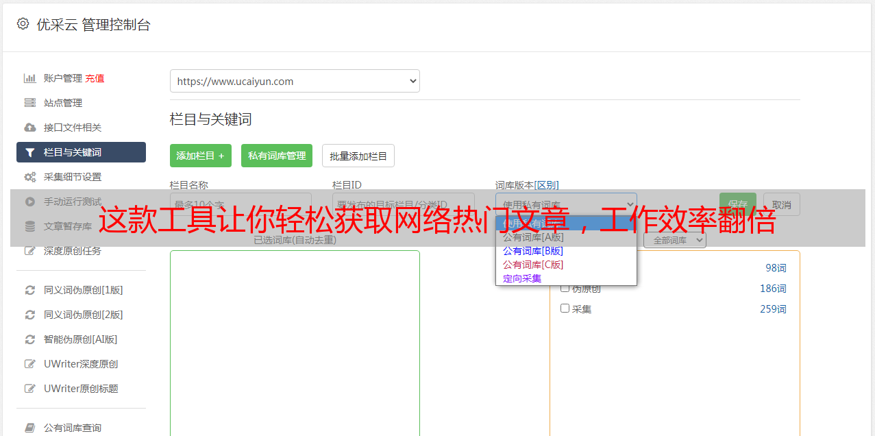 优采云是一款高效的在线文本采集工具,助力用户快速精准地获取网络热门文章及其相关信息。作为长期运用此款软件的内容创作者,深知它在提高工作效率和作品品质方面的重要性。除了广泛的数据来源支持外,优采云还拥有强大的数据处理和分析能力,使得非技术人员也能轻松掌握。