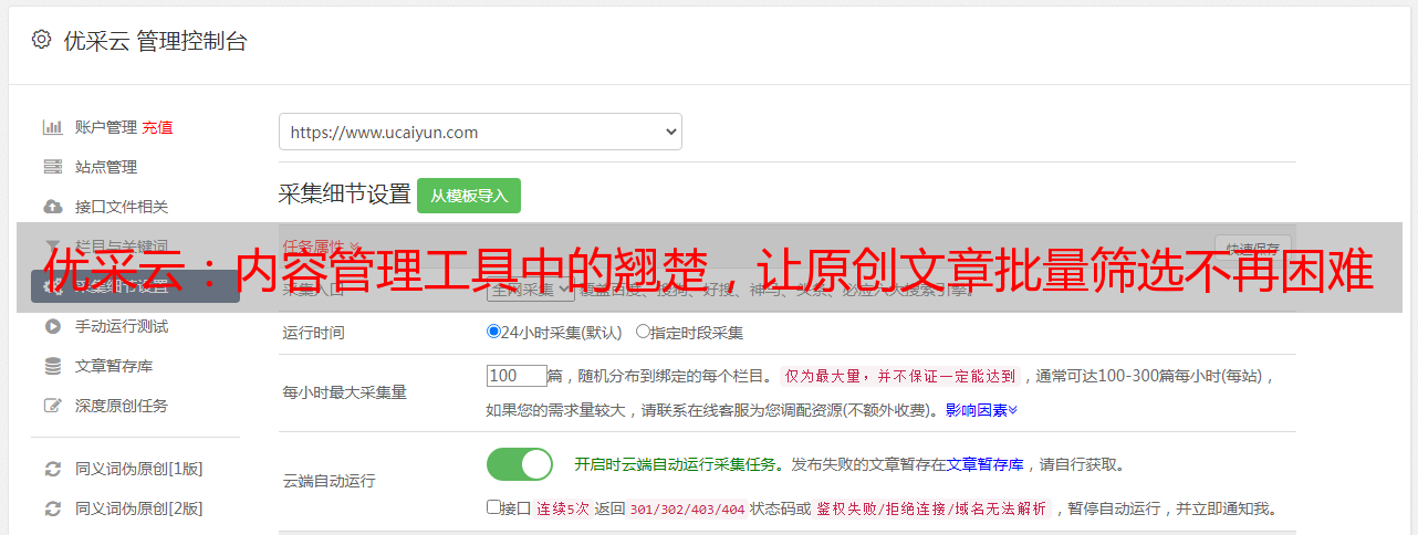 借助优采云的原创文章批量筛选择项,创作者与平台能够高效把控内容品质,确保原创度。伴随着科技持续发展,优采云将持续提升功能性能,致力于为广大用户提供智能化以及便捷性的优质服务。