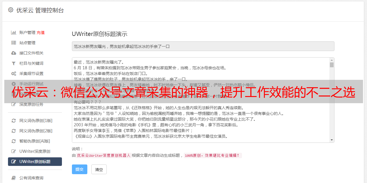 另外,优采云也对内容制作者极其重要。不仅能协助他们把握行业动态,汲取创意素材,还能利用其功能进行内容剽窃的检测。优采云让创作者实现更有效的作品创作流程管理,进而提高作品水平。