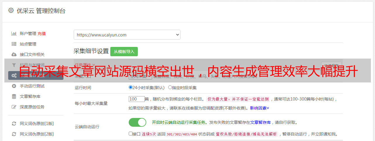 优采云 发布时间: 2024-07-07 17:31在现代科技与内容管理融合之下诞生的自动采集文章网站源码,显著提升了内容生成及管理效率。优采云,此领域的翘楚,提供卓越功能及丰富配置选择,涉足个人博客至大型门户网站等各类应用场景。
