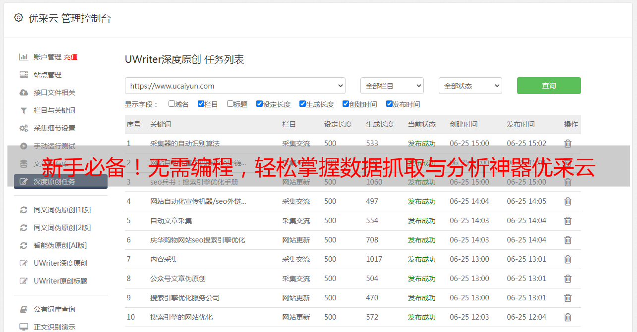 优采云不仅具备基本数据收集功能,还配备诸多高级特性如定时采集、多线程采集以及数据解析等。定时采集支持用户设定固定时间段的采集任务,方便定期更新的需求;而多线程采集则能显著提升采集效率,尤其在处理海量数据时表现更为突出。