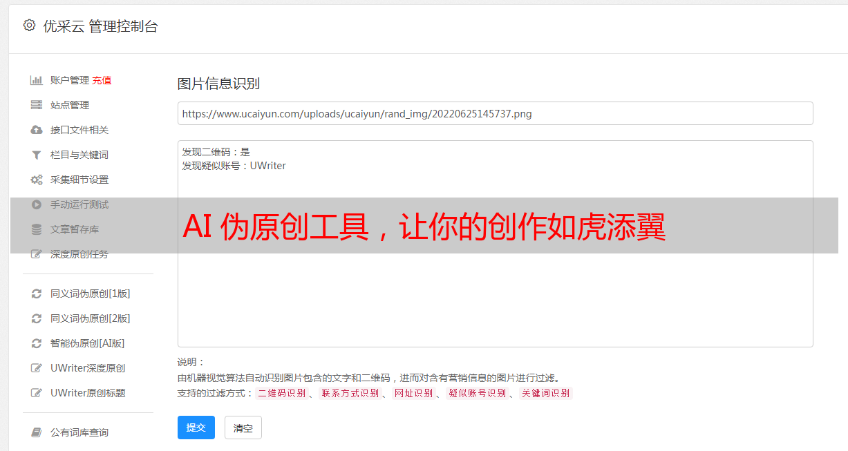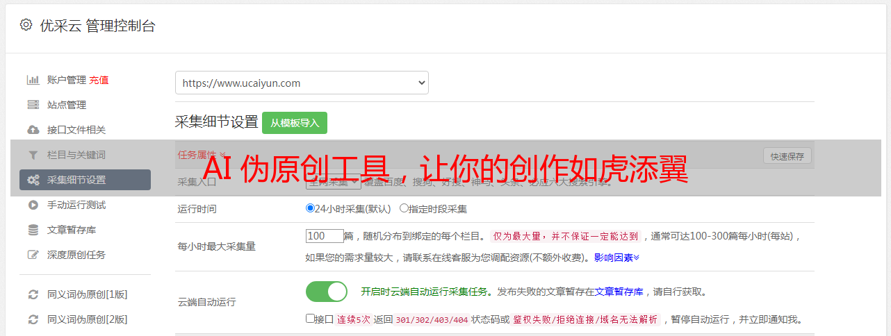 优采云AI伪原创工具是具备人工智能技术的优质内容*敏*感*词*,旨在协助各类用户高效制作高质量伪原创内容。无论是从事新闻编辑、博客写作,抑或是在搜索引擎优化领域的人士,皆可从其广泛适用性中获益。运用得当并进行优化后,用户可进一步提升此工具性能,从而产出更为珍贵且引人入胜的内容。
