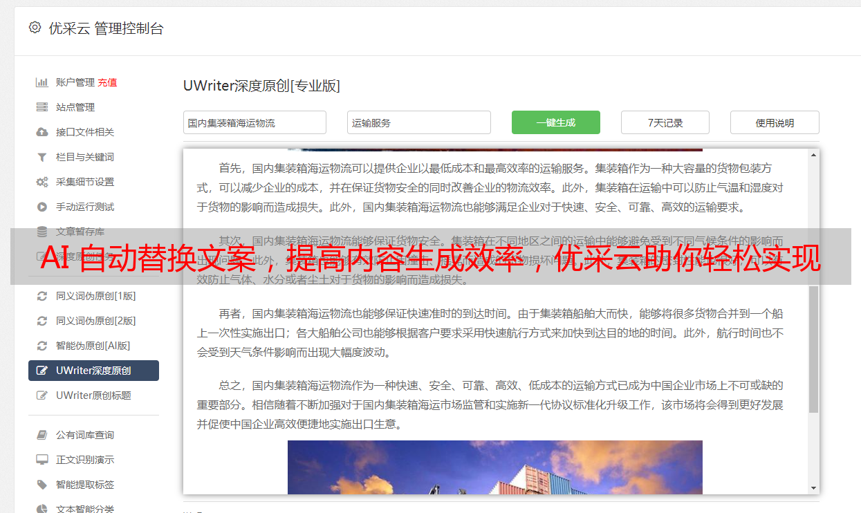 优采云主要特色之一就是AI自动替换文案功能。此项技术采用深度自然语言处理技术,可迅速鉴别和替换文案关键字句,进而生成全新的内容版本。此举既节约了大量人工成本,又能在保留原文主旨的同时,丰富内容的多元性。