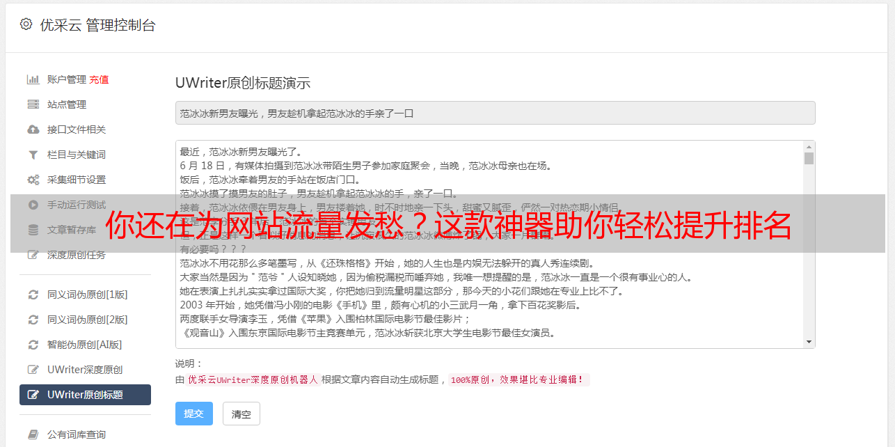 网站内容多元化及更新频率对维持用户关注度与提升搜索引擎Rank至关重要。优采云SEO文章*敏*感*词*可生成各类内容,如博客、新闻稿、商品诠释等,以适应各式网站需求。