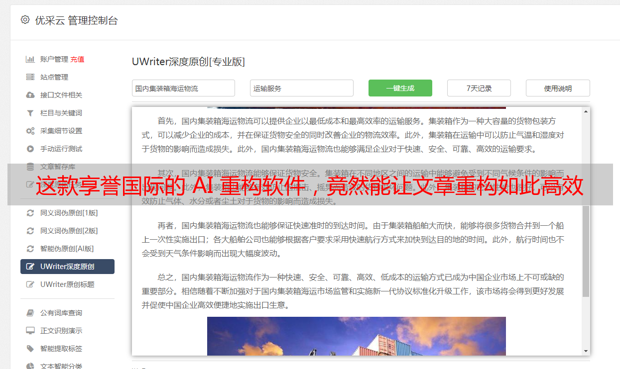 优采云 发布时间: 2024-07-14 11:34在全球信息化的今天,跨语言交流的需求大幅增加,尤其对需精准快速完成内容多语言转换的专业人士与组织而言,优选高效智能的AI文章重构软件显得至关重要。其中,优采云,作为享誉国际的AI重构软件,凭借其强大的性能及便捷的使用体验,为广大用户带来巨大便利。本篇文章将从多个方面深入剖析如何充分运用优采云进行文章重构,从而提高翻译品质与效率。