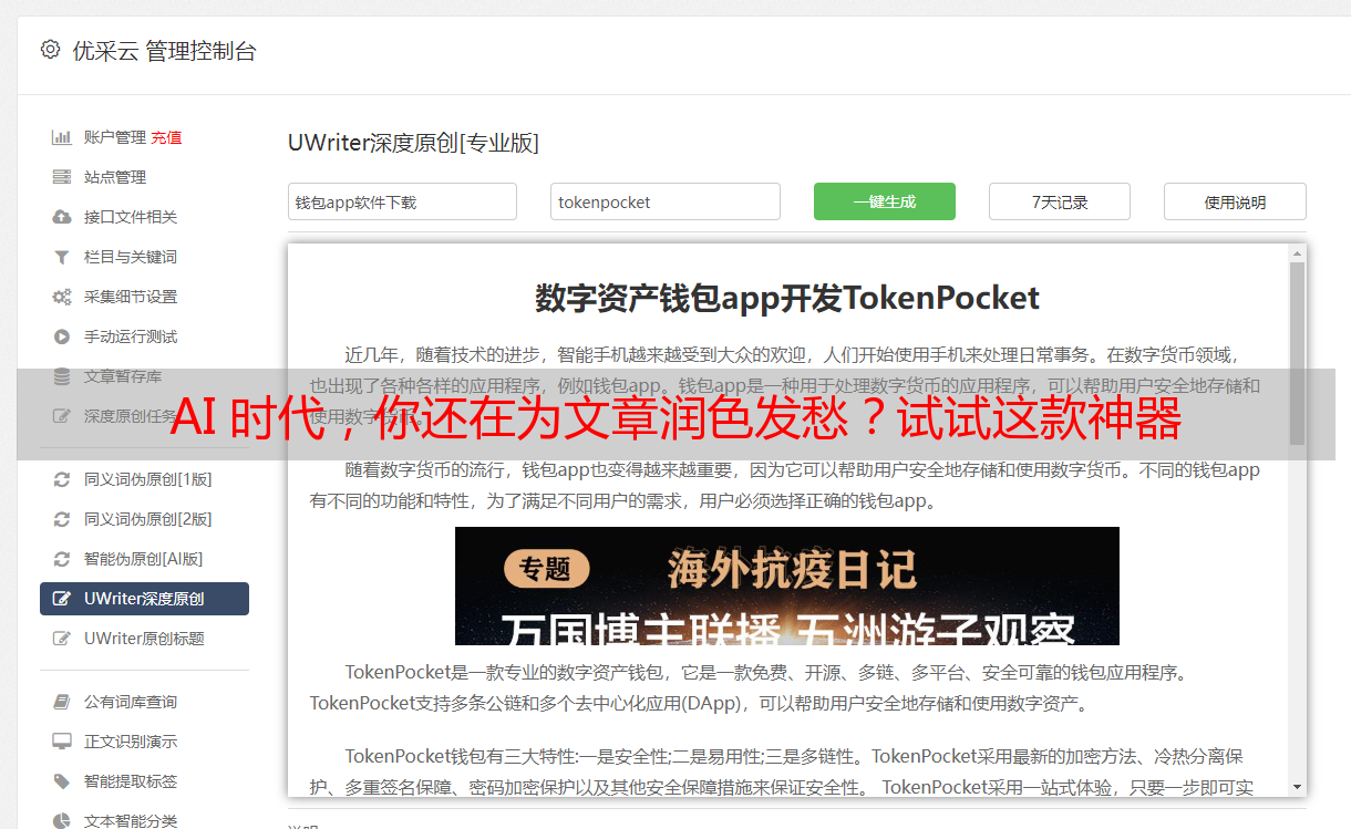 优采云 发布时间: 2024-07-14 22:06随着数字时代的深化发展,人工智能(AI)已然成为我们生活中的重要组成,尤其是在文字处理方面。AI能够协助我们完成日常文本工作,同时也在文章润色上展现出强大的功能。优采云作为一款尖端的AI写作工具,其应用范围正在逐步扩大。本篇文章将详细介绍如何运用优采云进行文章润色,从而提高写作水平。
