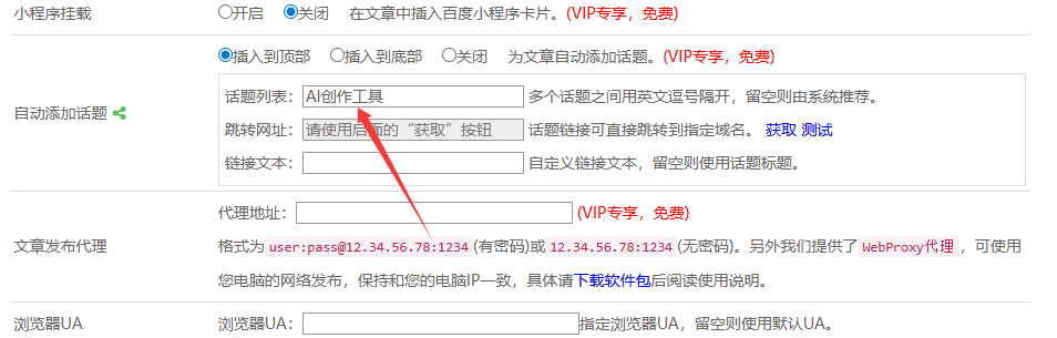 在话题列表处,填写你想要插入的话题名称,此处话题必须是已经存在于百家号系统的话题名称,具体请到百家号后台核实。