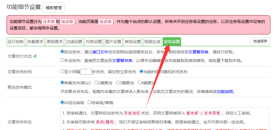 优采云 发布时间: 2025-08-24 15:05首先在功能细节设置中切换到发布设置:
