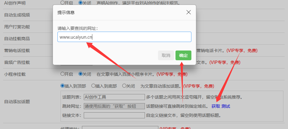 点击跳转网址输入框后面的获取按钮,在弹出的提示框中输入你想要跳转的域名,注意此域名必须是百度已经收录、通过域名搜索能出现在百度首页的。