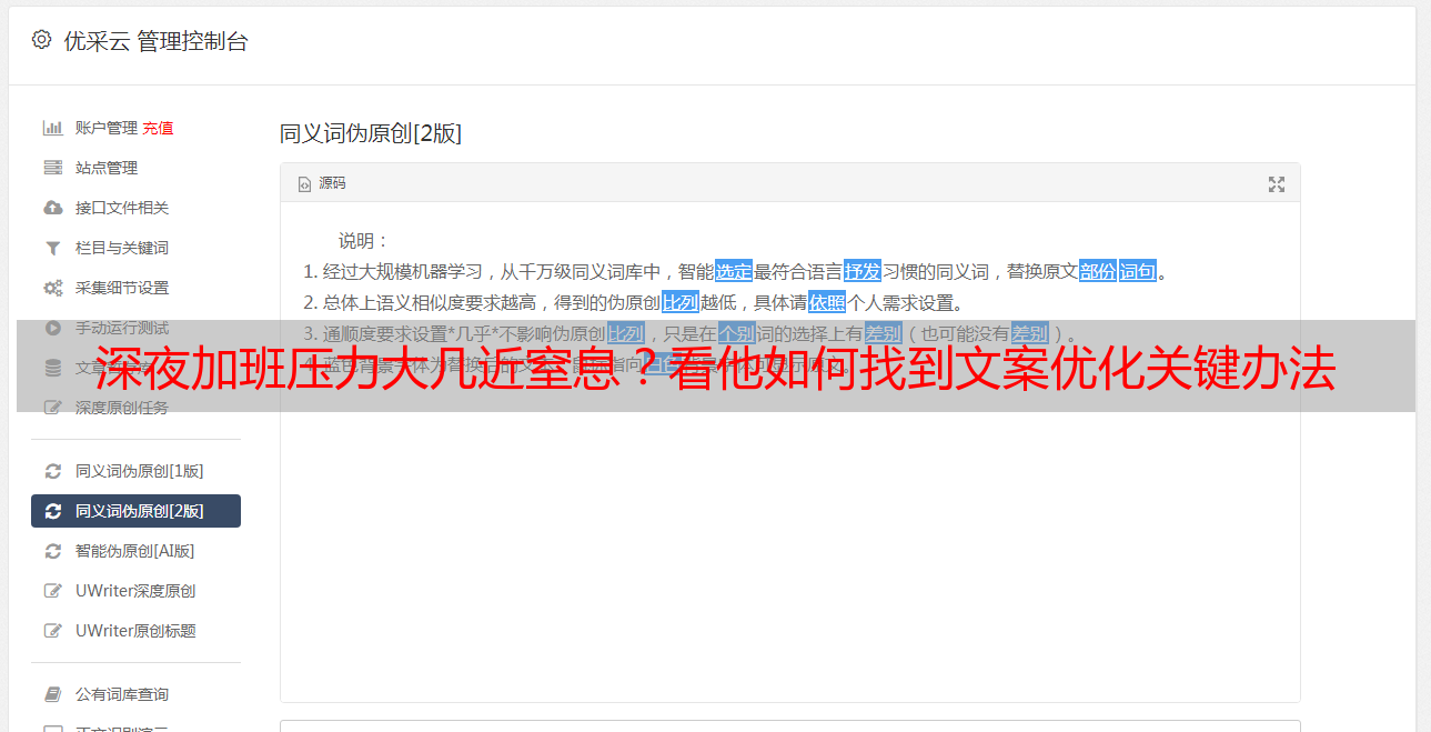 沈墨言发现,优采云具有深度改写功能,该功能与传统工具简单的同义词替换不同,它借助先进人工智能算法,能生成全新内容版本,在不改变原意的情况下,通过替换同义词、调整句子结构、重组段落等方式来实现。