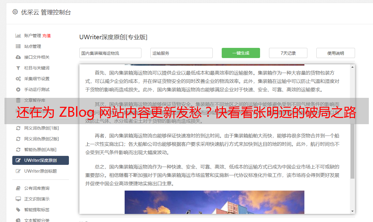优采云 发布时间: 2025-10-26 13:45倘若你正为ZBlog网站内容更新而发愁,每日耗费大量时间去手动采集文章,还要手动编辑文章,那么我朋友张明远的经历,或许能够给你些许启发。
