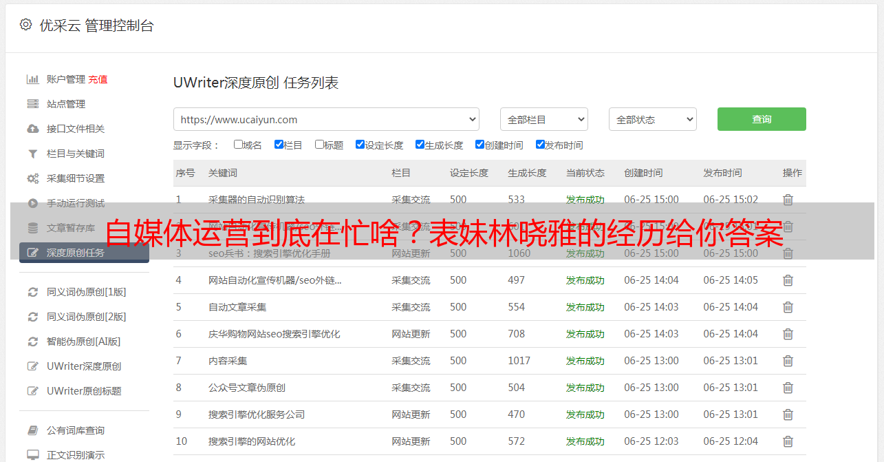 其后,她于优采云之中将原创任务的状态予以开启,设定每一小时的时间里生成一定数量的原创文章 。