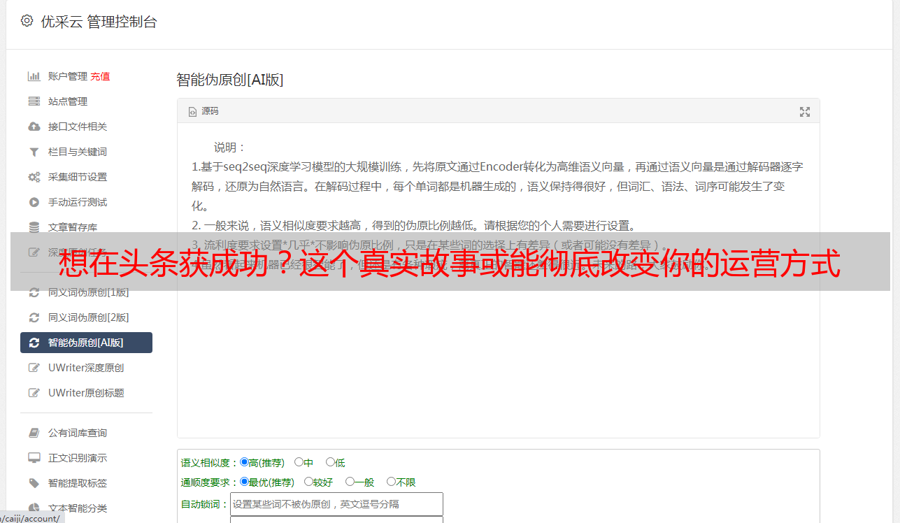 参与行业交流期间,他知悉众多成功运营者,均 在运用自动化工具,像优采云这样 的AI内容生成工厂类型 的工具 。