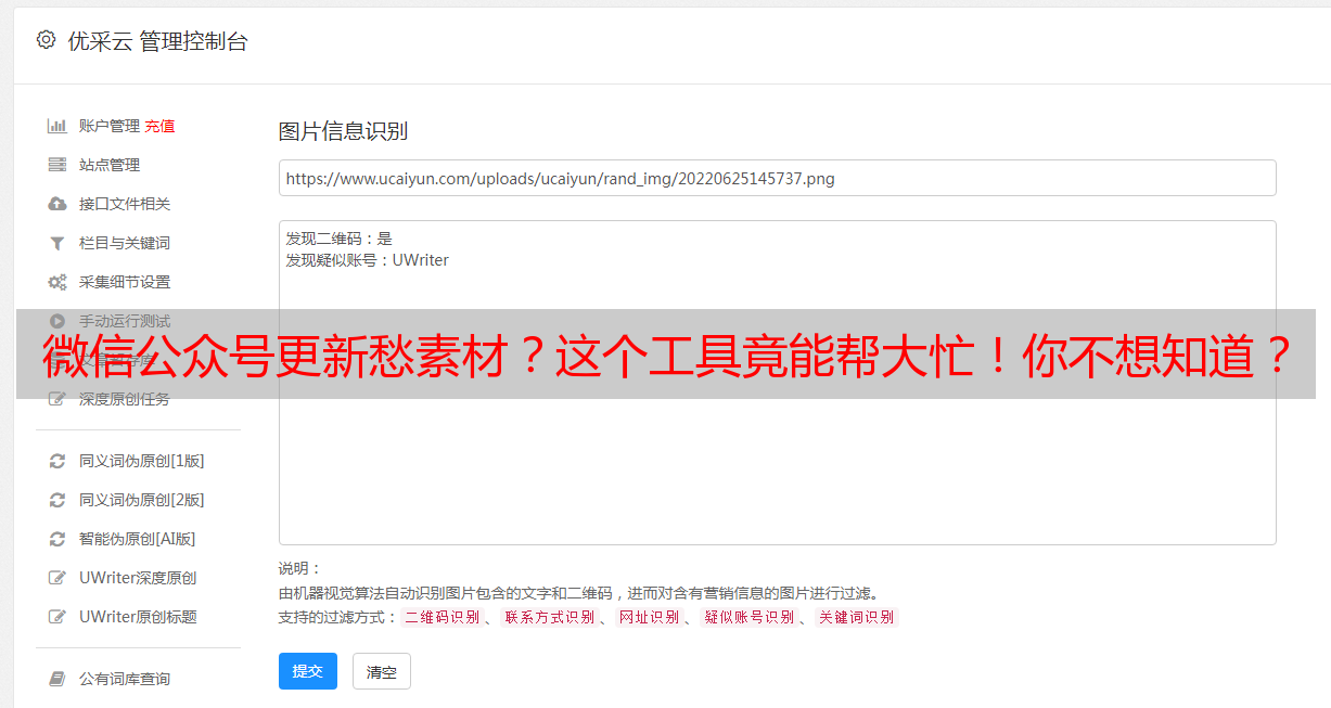 那时,他针对优采云的功能详情展开了深入探究,发觉其给出了内容词汇过滤以及垃圾文本过滤的选项。